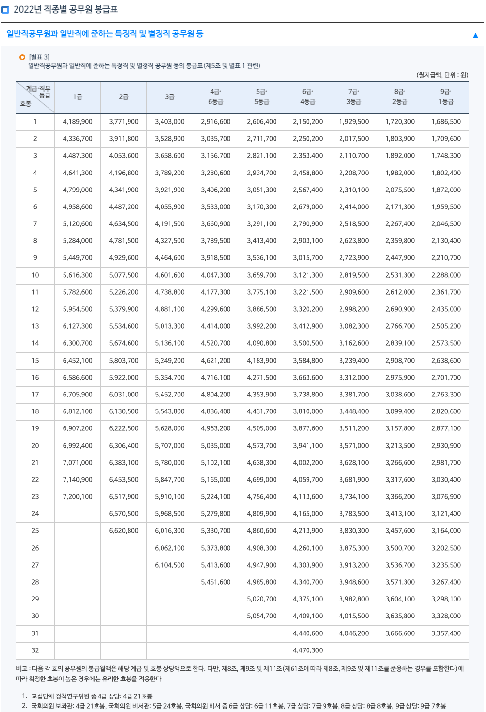 ▶ 2022년 공무원 호봉별 월급 / 연봉표