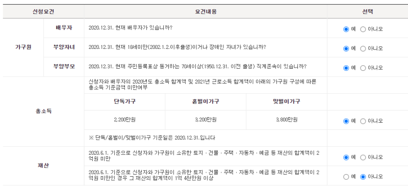 - 2020년 6월 1일 기준으로 가구원 모두가 재산 합계액이 2억 원 미만이어야 합니다.