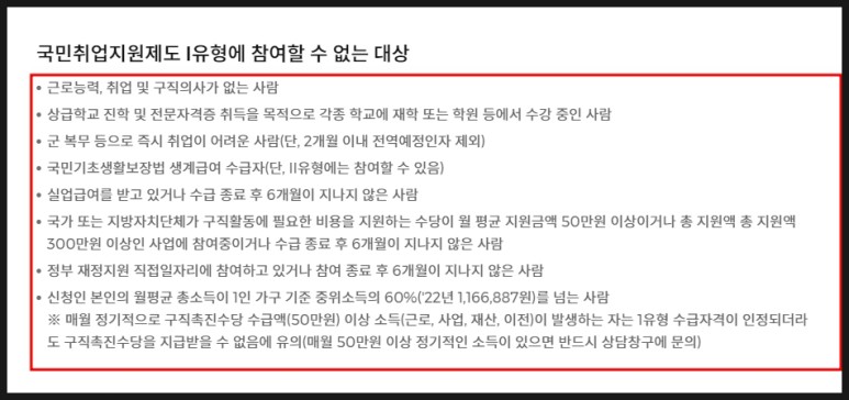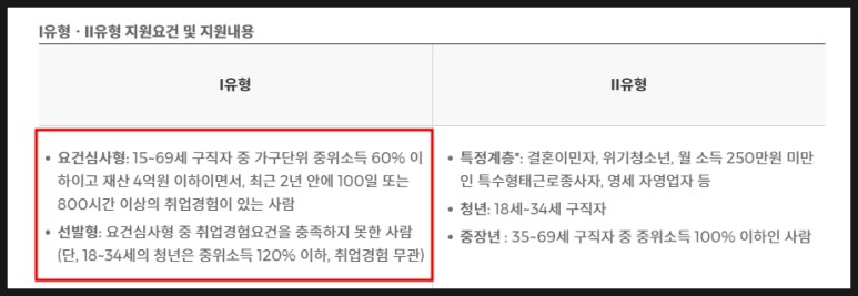 1. 요건심사형 : 15~69세 구직자 중에서 가구단위 중위소득 60% 이하이면서 최근 2년 내 100일 혹은 800시간 이상의 취업경험이 있으며 재산은 4억원 이하일 경우