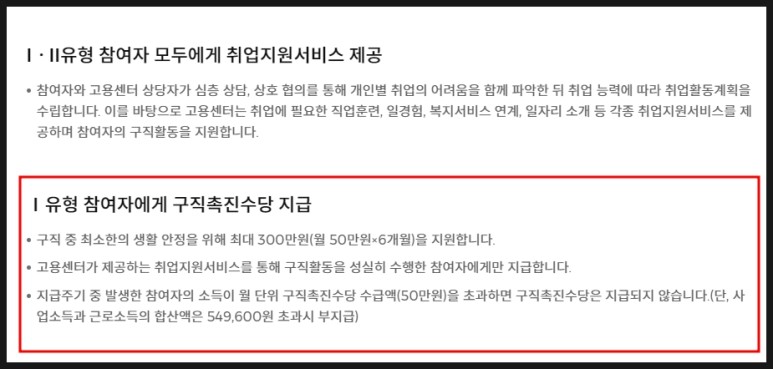 - 월 50만원씩 6개월을 지원하고 있으며, 취업지원 서비스를 통해서 구직활동을 성실하게 수행한 사람에 대해서 지급합니다. 만약 지급 주기 중 참여자의 소득이 월 단위 구직촉진 수당 50만원을 초과할 경우 수당은 지급되지 않습니다.