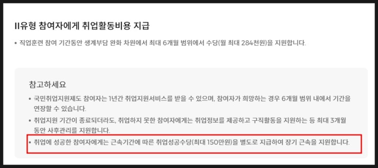 - 특히 1유형이건 2유형이건 취업에 성공한 참여자의 경우 근속 기간에 따라서 취업 성공 수당을 최대 150만원까지 별도로 지급 받을 수 있습니다.
